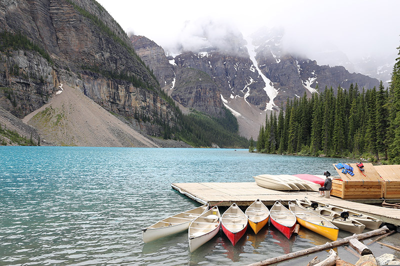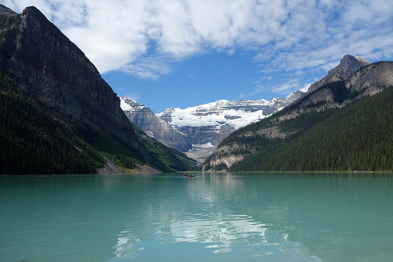 จากกลางทะเลสาบ ถ้าเราพายเรือแคนู จะเห็นรีสอร์ท The Fairmont Chateau Lake Louise ตั้งอยู่เพียงรีสอร์ทเดียว ใครที่อยากสัมผัสกับวิวทิวทัศน์และดื่มด่ำกับบรรยากาศสุดอลังการนี้ ทางรีสอร์ทเค้าก็มีห้องพักไว้รองรับโดยสนนราคาจะอยู่ที่คืนละประมาณ 300 เหรียญแคนาดา ถัดขึ้นไปบนเขาหลังโรงแรมจะสกีรีสอร์ทที่มีกอนโดล่าให้ขึ้นไปชมวิวมุมสูงตลอดปี