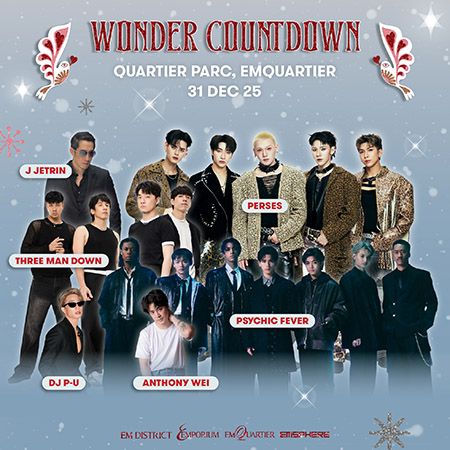 นอกจากนั้น ยังยกทัพศิลปินชื่อดังแถวหน้าของเมืองไทยร่วมสร้างสีสันและความสนุกแบบ นัน-สต็อป ร่วมเคาท์ดาวน์นับถอยหลังสู่ปีใหม่ 2026 ในบรรยากาศสุดอลังการ กับการแสดงคอนเสิร์ต แสง สี เสียง สุดตระการตาที่จะร่วมมอบความประทับใจให้ทุกคนส่งท้ายปี สร้างแลนด์มาร์กแห่งความสุขใจกลางถนนสุขุมวิท ด้วยกิจกรรม WONDER COUNTDOWN สนุก สุดมันส์กับการแสดงจากศิลปินชั้นนำของเมืองไทยและต่างประเทศ ได้แก่ เจ เจตริน, บุรินทร์, TREE MAN DOWN, PERSES ศิลปิน J-POP PSYCHIC FEVER,ANTHONY WEI และดีเจชั้นนำ, DJ P-U ที่ QUARTIER PARC ศูนย์การค้าเอ็มควอเทียร์ ในค่ำคืนเคาน์ดาวน์ส่งท้ายปีเก่า 31 ธันวาคม 2568 ก่อนร่วมกันนับถอยหลังพร้อมกันสู่ปี 2026 อย่างยิ่งใหญ่