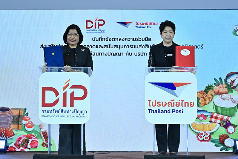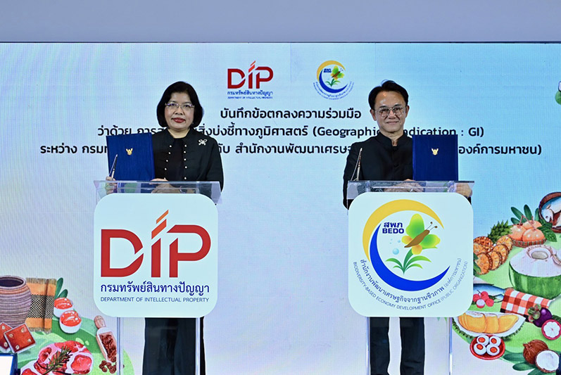 ในโอกาสเดียวกันนี้ กรมทรัพย์สินทางปัญญาได้ประกาศความร่วมมือกับ 2 หน่วยงานพันธมิตรสำคัญ ได้แก่ สำนักงานพัฒนาเศรษฐกิจจากฐานชีวภาพ (องค์การมหาชน) หรือ BEDO และ บริษัท ไปรษณีย์ไทย จำกัด ผ่านการลงนามบันทึกข้อตกลงความร่วมมือ (MOU) ร่วมกัน เพื่อส่งเสริมสินค้า GI อย่างเป็นระบบและครบวงจร โดยความร่วมมือระหว่างกรมฯ และ BEDO จะมุ่งเน้นประเด็นเรื่องความยั่งยืนตั้งแต่ต้นน้ำ ในการอนุรักษ์และรักษาวัตถุดิบต้นกำเนิดในการผลิตสินค้า GI การใช้ความคิดสร้างสรรค์และนวัตกรรมเพิ่มมูลค่าให้กับสินค้า ตลอดจนการส่งเสริมการพัฒนาชุมชน GI ให้มีความเข้มแข็ง สามารถสร้างรายได้และบริหารจัดการสิทธิในสินค้า GI ร่วมกันได้อย่างมีประสิทธิภาพ และผลักดันสินค้า GI ให้เติบโตและได้รับการยอมรับในระดับประเทศและนานาชาติอย่างกว้างขวาง