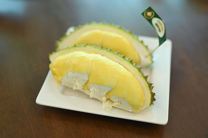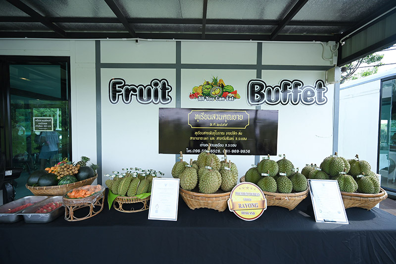 ทั้งสายพันธุ์พื้นเมือง อาทิ นวลทองจันทร์ นกหยิบ พวงมณี หลงลับแล มูซันคิง หรือสายพันธุ์ยอดนิยมอย่างก้านยาวและหมอนทอง รวมถึงผลไม้ตามฤดูกาล และอาหารคาว-หวานอีกมากมาย เช่น แกงเขียวหวานทุเรียน ยำทุเรียน แกงส้มทุเรียน แกงหมูใบชะมวง แกงบวดทุเรียน ข้าวเหนียวทุเรียน บัวลอยทุเรียน ซึ่งจะสลับเมนูมาให้ชิม ที่สวนคุณยาย จังหวัดระยอง”