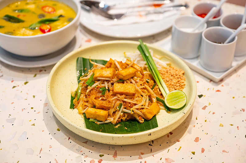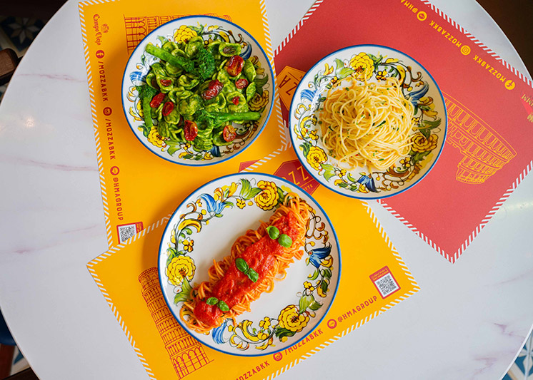 - สปาเก็ตตี้ซอสหลนน้ำชุบหยำเจ แรงบันดาลใจจาก “น้ำชุบหยำ” อาหารพื้นบ้านใต้ที่ให้รสกลมกล่อมเค็มมัน เผ็ดนัว นำมาปรุงในรูปแบบซอสหลนเจ ครีมมี่จากกะทิและเต้าเจี้ยวเจ เพิ่มความหอมด้วยโหระพา แล้วปรับให้นุ่มนวลด้วยโปรตีนกุ้งเจ เสิร์ฟคู่เส้นสปาเก็ตตี้ต้มสุกคลุกน้ำมันมะกอกเล็กน้อย จะได้รสชาติที่กลมกล่อม เป็นการพบกันของ “ใต้” และ “อิตาเลียน” ที่ลงตัว