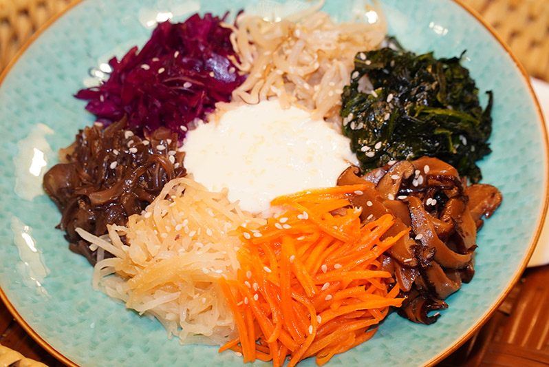 - ข้าวยำเกาหลี (bibimbap) จากเมนูดังสัญชาติเกาหลี รังสรรค์ซอสเจที่ทำจากเต้าหู้และซอสเห็ดหอม ให้มีรสชาติที่ลงตัวสไตล์เกาหลี พร้อมเลือกใช้ผักหลายชนิด นำมา ผัด,หมัก,ดอง เพื่อให้ได้หลากหลายรสชาติและเนื้อสัมผัสที่หลากหลาย
