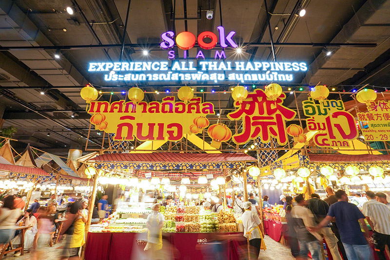 คุณบัญชา ฉันทดิลก กรรมการผู้จัดการโครงการสุขสยาม เผยว่า “เทศกาลกินเจปีนี้ เราอยากให้ผู้มาเยือนได้สัมผัสรสชาติแห่งความสุข ผ่านอาหารเจที่ดีต่อใจและดีต่อสุขภาพ ที่ให้รสชาติแบบต้นตำรับแท้ ถึงรสถึงเครื่องเหมือนรับประทานเมนูโปรดที่คุ้นเคย ผ่านเมนูอาหารเจ 4ภาค ทั้งเหนือ กลาง อีสาน ใต้ และปีนี้ยังพิเศษกว่าเดิมด้วยการรังสรรค์เมนูเจฟิวชันทั้งสไตล์เอเชียและยุโรปที่มีให้เลือกมากมาย เพื่อให้ทุกคนได้อิ่มบุญไปพร้อมกับอิ่มอร่อยอย่างแท้จริง”