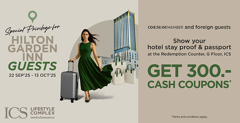 โดย ICS Lifestyle Complex มอบความพิเศษให้กับสมาชิก ONESIAM ที่เข้าพักในโรงแรม Hilton Garden Inn Bangkok Riverside เพียงแสดงหลักฐานการเข้าพัก พร้อมบัตรประชาชนหรือพาสปอร์ต ณ จุดแลกของสมนาคุณ ชั้น G ICS Lifestyle Complex สามารถแลกรับทันที คูปองส่วนลดแทนเงินสดมูลค่า 300 บาท (มูลค่าใบละ 100 บาท สำหรับใช้ ณ ร้านค้าภายในไอซีเอสที่ร่วมรายการ ขั้นต่ำ 300.- ขึ้นไป, จำนวนรวม 3 ใบ) จำกัด 1 สิทธิ์ / ท่าน / วัน / การจองห้องพัก และจำกัดการแลกรับสูงสุด 2 สิทธิ์ / ท่าน ) สำหรับใช้เป็นส่วนลดในร้านค้าที่ร่วมรายการ รวมกว่า 40 ร้านค้า และแบรนด์ชั้นนำ ครบครันทุกไลฟ์สไตล์ ทั้งร้านอาหารชื่อดัง