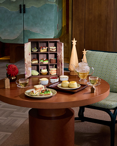 Sky Garden Afternoon Tea ประกอบด้วยชาออร์แกนิกจากอรักษ (Araksa) อำเภอแม่แตง จังหวัดเชียงใหม่ หนึ่งในไร่ชาที่เก่าแก่ที่สุดในประเทศไทย ซึ่งยังคงสืบสานวิถีการผลิตแบบดั้งเดิมและเกษตรยั่งยืน เสิร์ฟคู่กับขนมหวานและของว่างเก้าชนิด อาทิ ฟัวกราส์เอแคลร์ทาร์ตกับเบอร์รี่ อะโวคาโดทาร์ตหน้ากุ้งตะไคร้และพริกสด มัทฉะฟินองเซียกับแยมราสป์เบอร์รี่ เค้กแครนเบอร์รี่ และสโคนสูตรคลาสสิก รับประทานคู่เนยสดจากฝรั่งเศส มาสคาร์โปนที่ตีจนขึ้นฟู และแยมส้มโฮมเมด