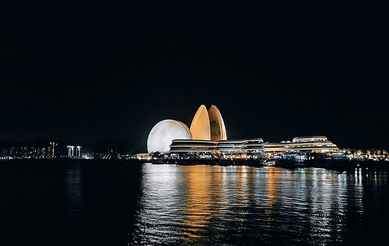 หนึ่งในแลนมาร์กสำคัญที่ไม่ควรพลาด เมื่อไปเที่ยวจูไห่ โรงละครที่รูปร่างสถาปัตยกรรมที่โดดเด่นแปลกตาคล้ายเปลือกหอยแห่งนี้ได้รับได้รับแรงบันดาลใจมาจากชื่อเมืองจูไห่ มีความหมายแฝงที่สื่อถึง“ไข่มุกที่เกิดในหอย และหอยที่เกิดในทะเล (珠生于贝,贝生于海)”ซึ่งก็มาจากชื่อเมืองจูไห่ หรือที่แปลตรงตัวว่า “ทะเลไข่มุก” รูปทรงเปลือกหอยฝาประกบกัน 2 อันดูกึ่งโปร่งใสในตอนกลางวัน และดูใสราวกับแสงจันทร์ในยามค่ำคืนด้วยเหตุนี้จึงเป็นที่มาให้กับชื่อเรียกของเปลือกหอยอันเล็กว่า “เปลือกหอยดวงจันทร์ (月贝)”ส่วนเปลือกหอยอันใหญ่เรียกว่า “เปลือกหอยดวงอาทิตย์ (日贝)” มีพื้นที่ 59,000 ตารางเมตร